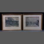 An interesting pair of golfing prints. THE GOLF STREAM by Tom Scott and PREHISTORIC GOLF ON THE BRAIDS. Each 34cm x 29cm approx.