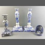 A DELFT candlestick 25cm tall (nibbles to neck), 2 SPODE candlesticks each 33cm tall approx, and an antique ARCADIAN CHARIOTS hooded candlestick with damage repaired