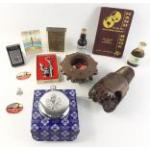 NORTH SEA OIL memorabilia to include two super original drill cutting heads, Red Adair stickers, two bottles of crude oil, a Zippo lighter etc. An interesting little collection.