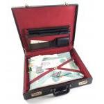 An excellent quality large briefcase containing Masonic apron etc. 49cm wide, 44cm deep, 9cm deep. Open combi lock set at 000. In excellent condition.