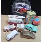 VOLKSWAGEN LOVERS - A VOLKSWAGEN split screen battery wall clock (looks cool!) with also two ceramic piggy banks, one Volkswagen camper van a beetle - with two model Volkswagens by Ada, etc