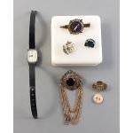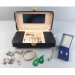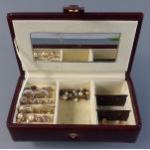 A quality wooden watch or necklace box with some gilt bling jewellery pieces. An interesting lot.