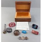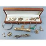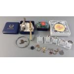 A very pretty small Gaudi Hydraulic Mosaic box with a nice selection of pretty small brooches. Includes one sterling silver engine turned blue enamel, a Scottish style twist with stone, an Edward VII silver coin bar brooch and others.