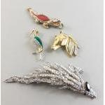 A collection of costume BLING animal kingdom brooches to include an articulated crocodile, a yellow metal horse head, a cool stork, a crocodile with a pink coloured resin decor