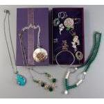 A jewellery cardboard box with a quantity of pretty mainly blue and green beads and brooches with stone one stamped 925. A pretty stag head Mizpah brooch, mother of pearl pendant etc.