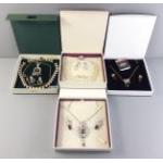 An elegant selection of four boxed necklaces and suites to include lovely Hollywood Greats necklace and earrings, similar with purple stones and a Cristalina box set.