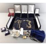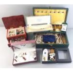 A small lot of useful jewellery boxes with some gilt chains in a wrapped roll with some earrings, badges, buttons etc.