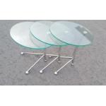 Nest of three tables. Glass topped with chrome legs. Unusual modernists design in good condition. Tallest 55cm high, diameter 50cm approx.