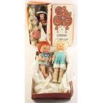 Three small dolls, one in traditional Welsh dress plus a furry rabbit by Clare (25cm tall)