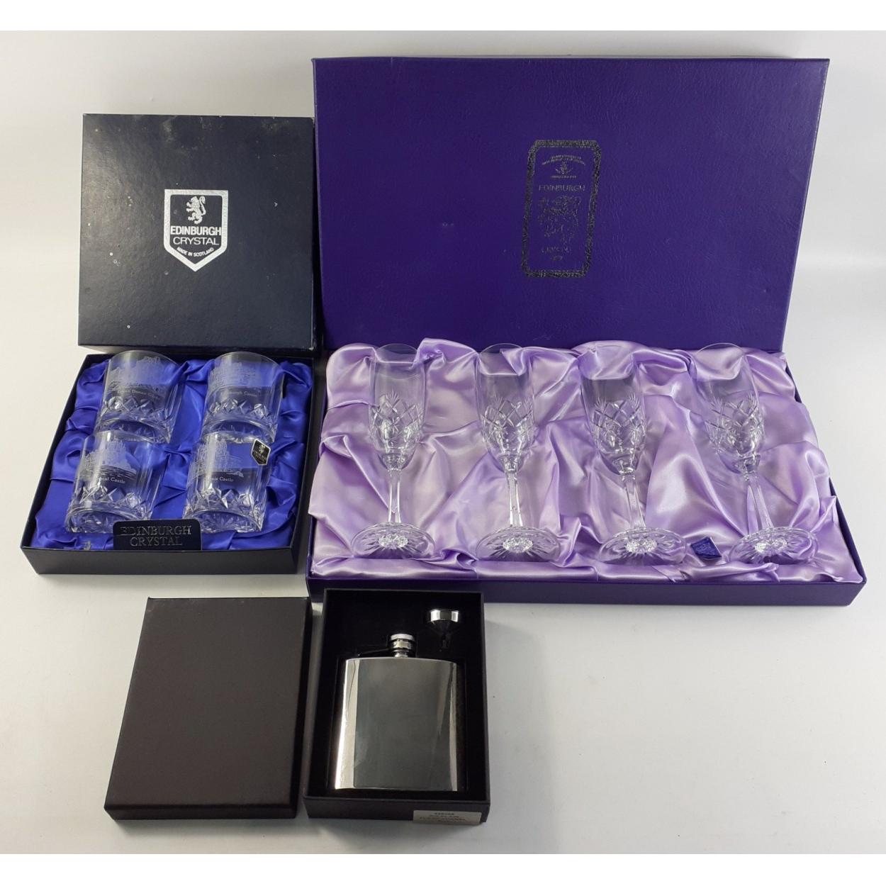 Edinburgh Crystal boxed Clans Castles Whisky tumblers, a boxed set of four champagne flutes, and a boxed whisky travel flask.