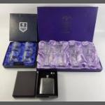 Edinburgh Crystal boxed Clans Castles Whisky tumblers, a boxed set of four champagne flutes, and a boxed whisky travel flask.