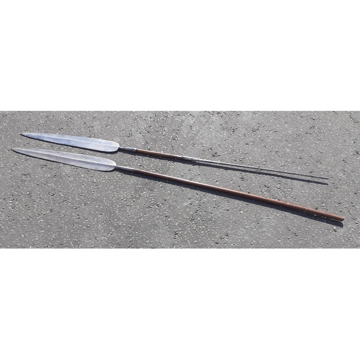 Two vintage African Spears. One metal shafted and the other wooden. Both approx 190cm long with 65cm blades.
