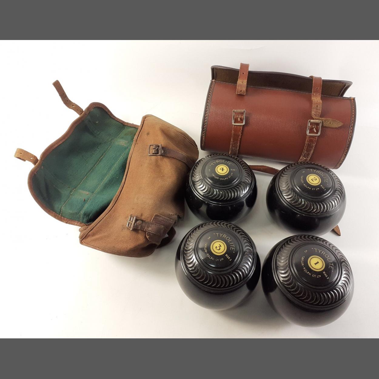 A set of four Tyrolite Taylor-Rolph Lawn Green Bowls in cases. Good used condition.
