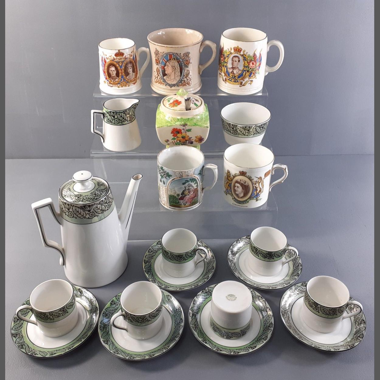 An attractive and useful Czech coffee set comprising 6 each of cups and saucers plus sugar and cream. Also a selection of royal commemorative mugs and others.