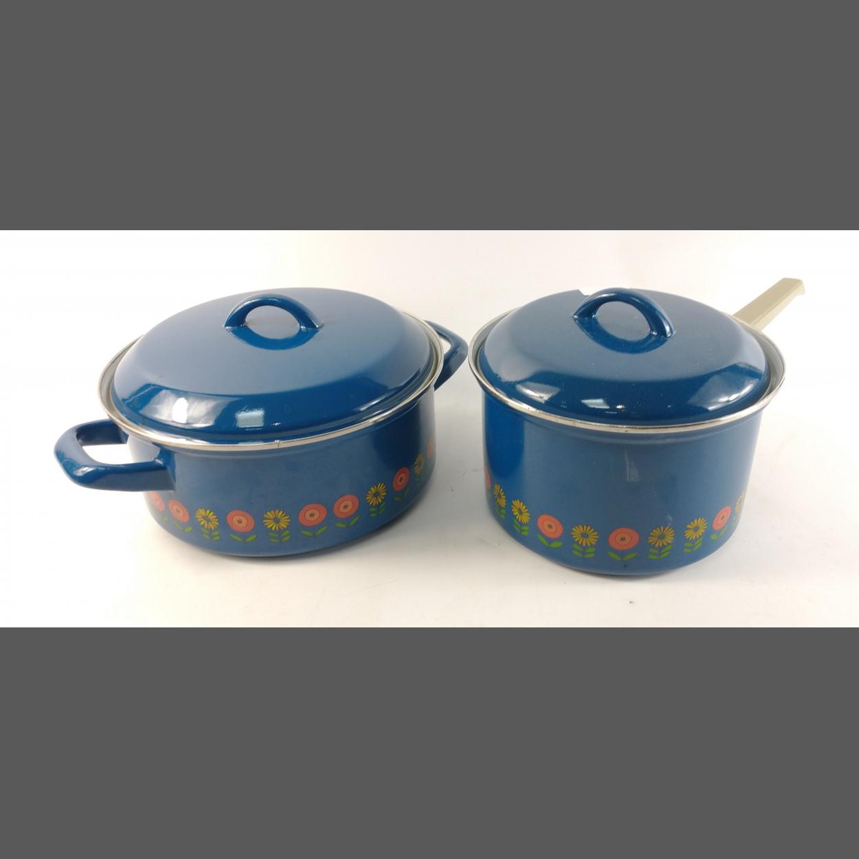 A used blue enamel saucepan and also a matching casserole dish. Both a good weight.