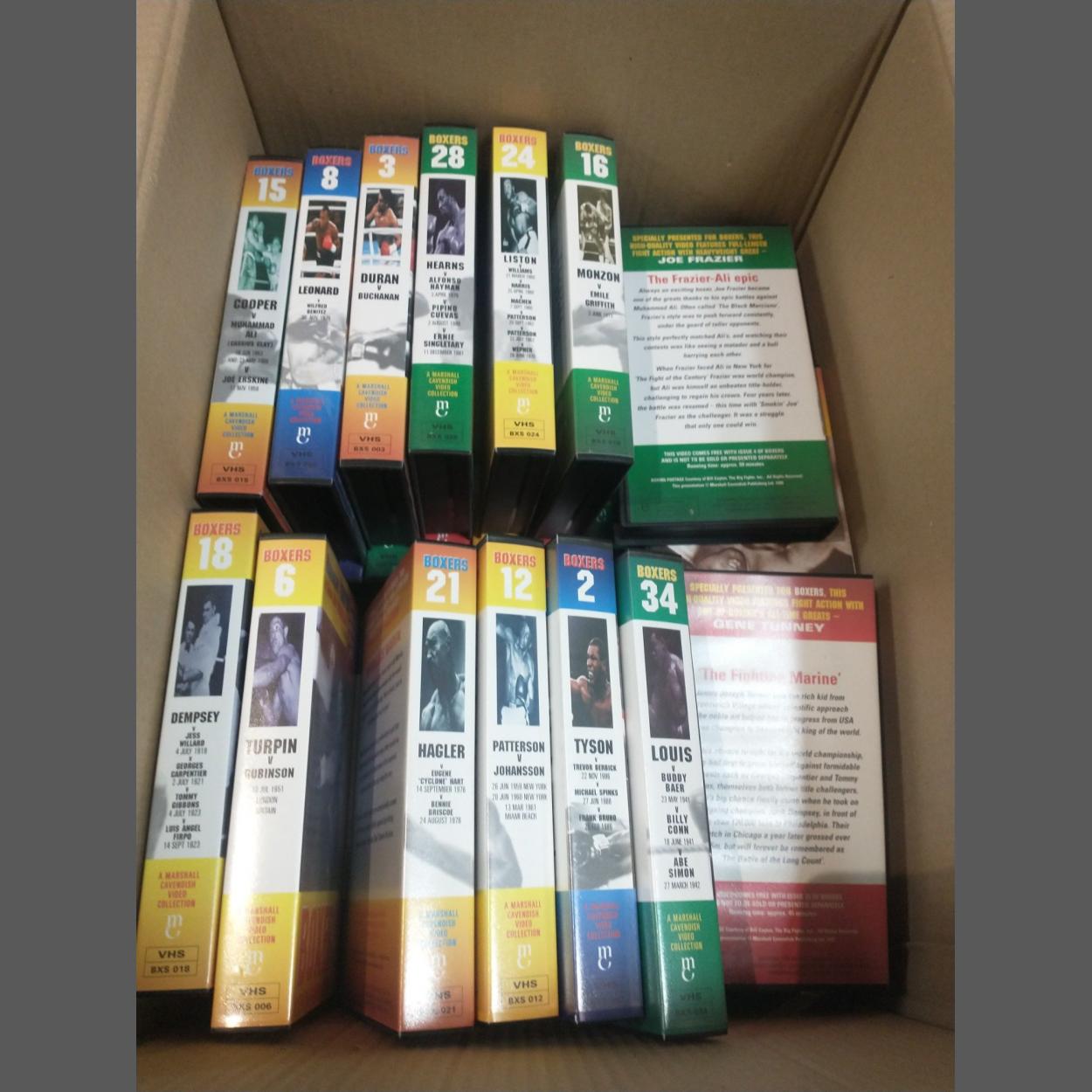 A box of Marshall Cavendish video collection BOXERS VHS tapes.