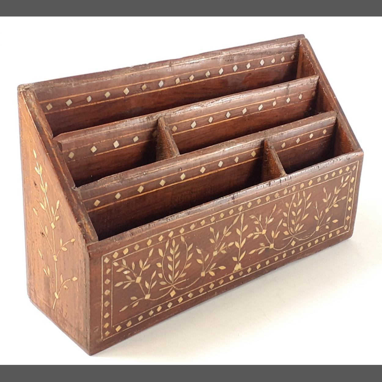 USEFUL STATIONERY TIDY - An Indian style inlaid wooden letter rack. 30cm x 18cm tall. Unusual and interesting item.