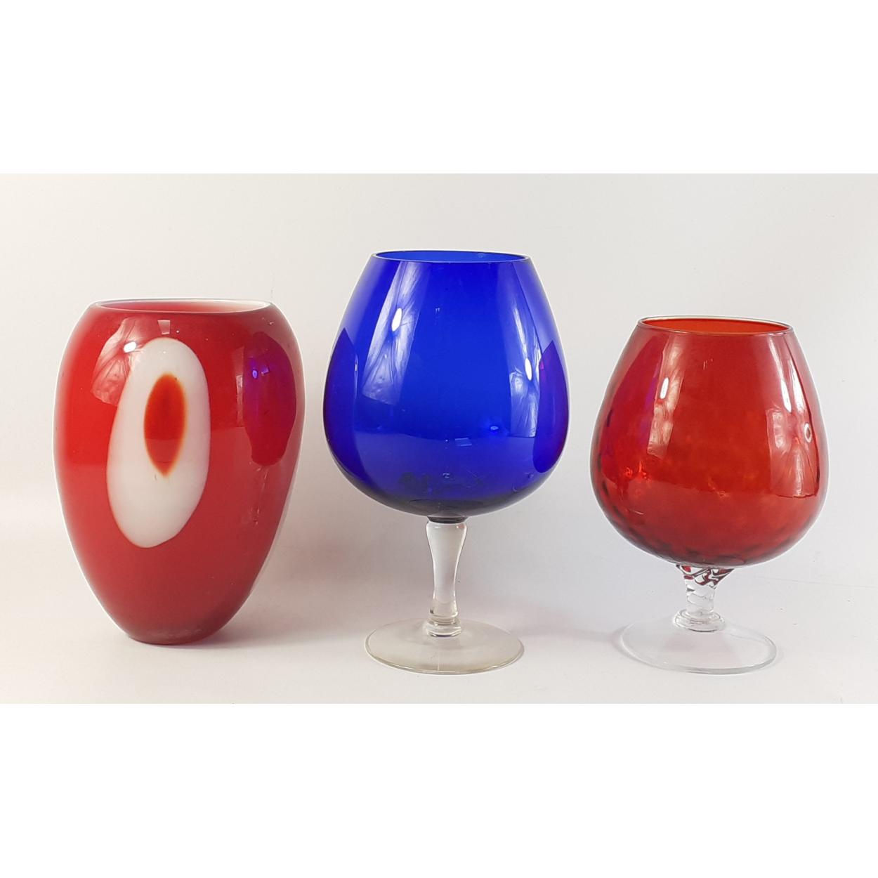 Two over-sized brandy glasses - blue one stands 27cm tall, the red one 23cm approx plus a red glass vase 24cm tall approx
