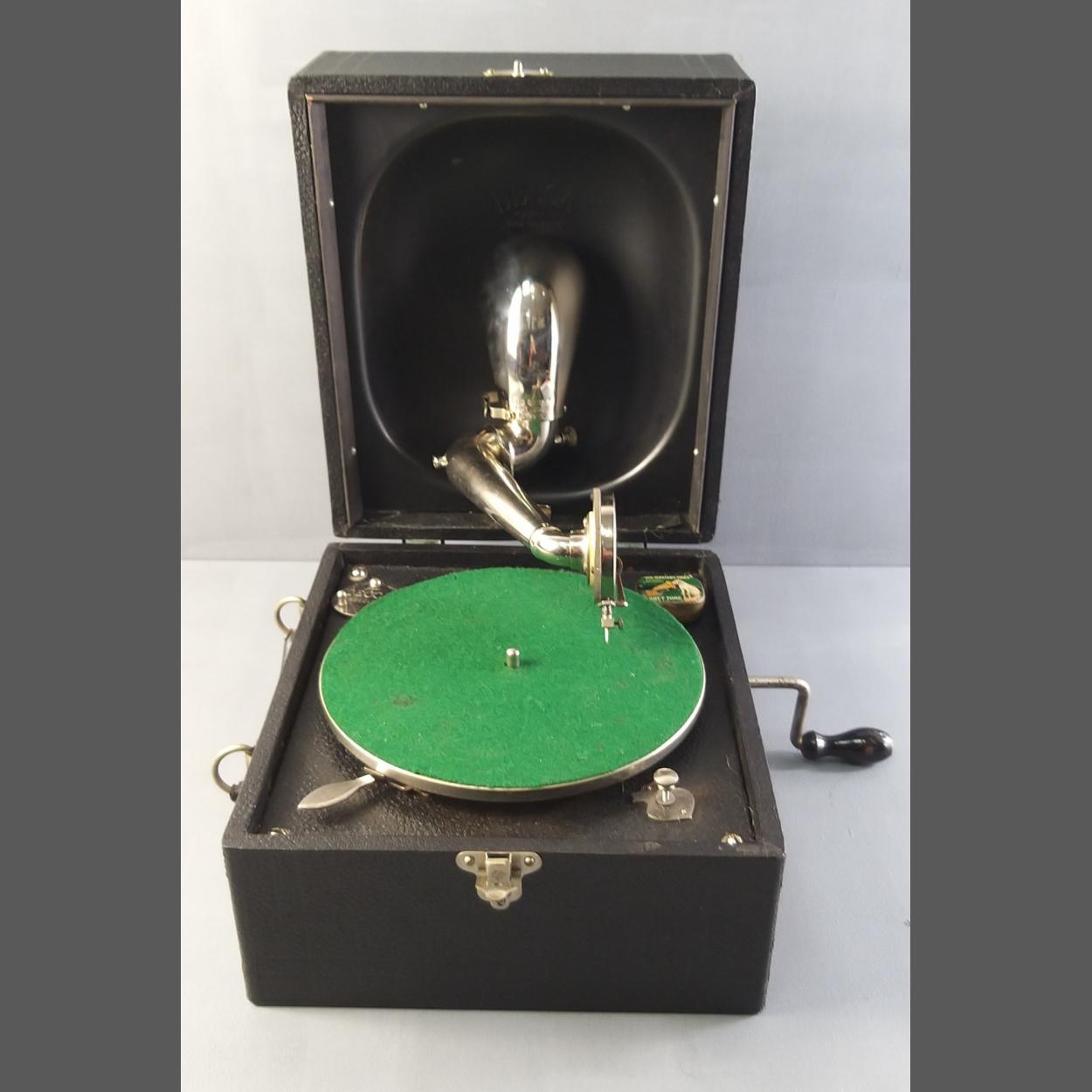 Small portable CRESCENDO JUNIOR SOUND BOX wind up gramophone with handle. Appears to be in working condition.