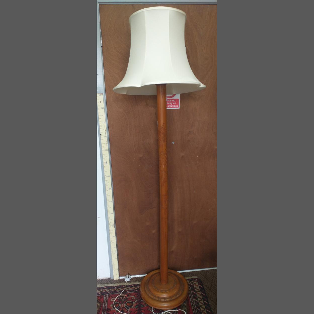 A floor standing far Eastern teak carved standard lamp with shade. Note bulb holder cracked and will need replaced. 160cm tall approx.
