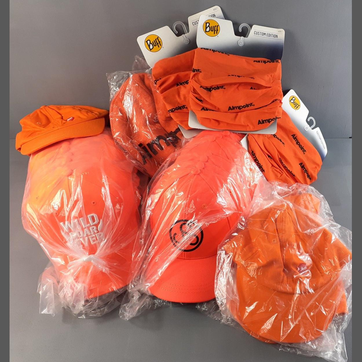 HUNTING INTEREST! Brand new hunting interest high visibility good quality wear, comprising WILD BOAR caps, LEICA caps, SAUER caps and others. All in DAYGLO orange.
