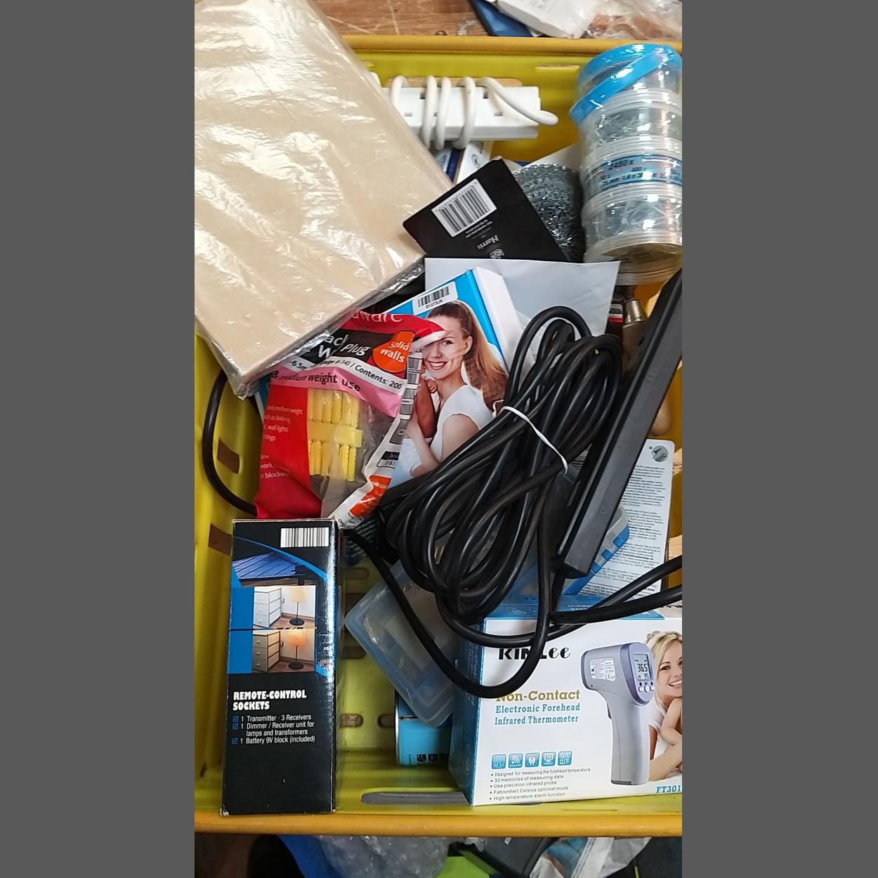 A mixed variety of tools to include fixings, fixtures, power socket extension cables, a volt meter etc