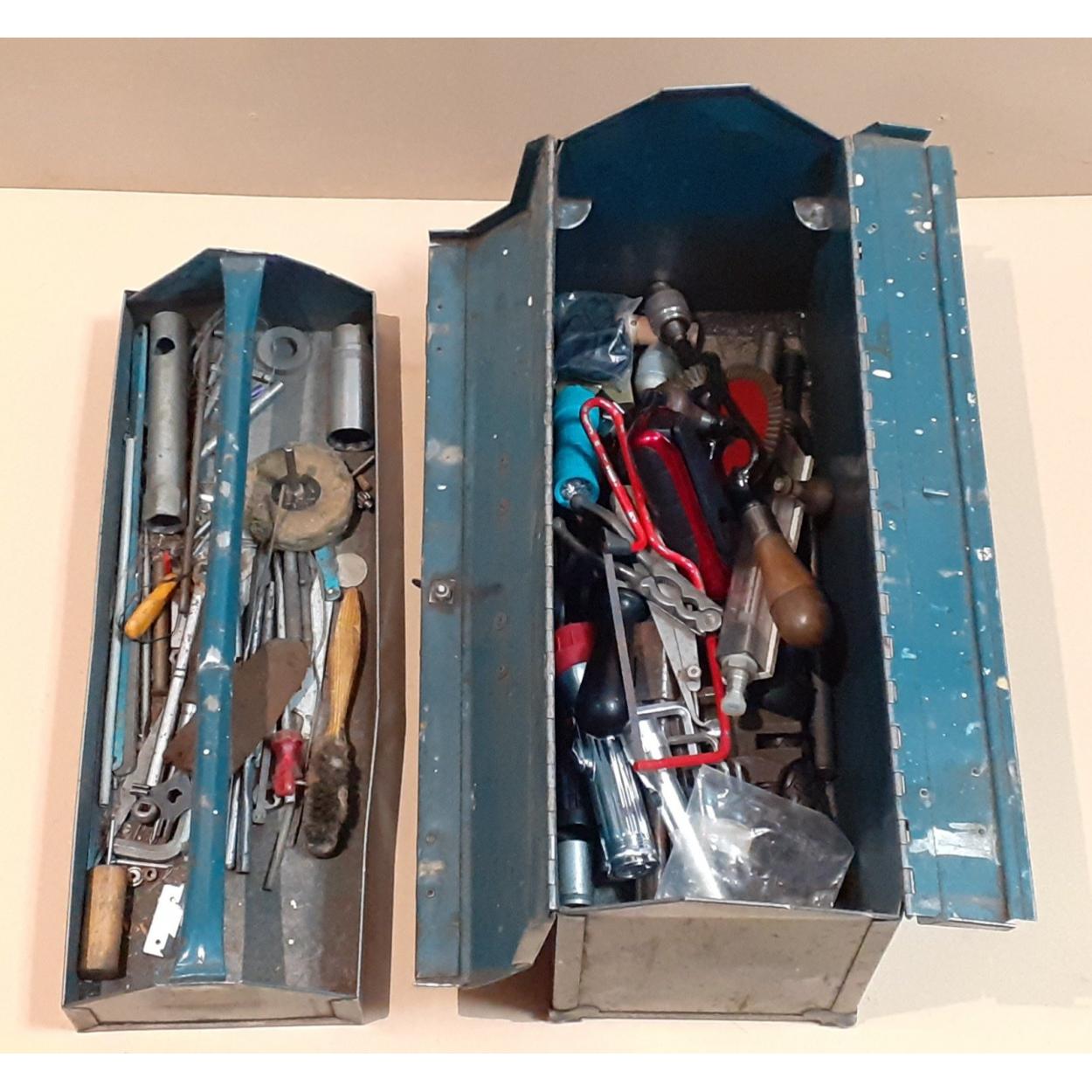 Blue metal cantilever tool box with contents.