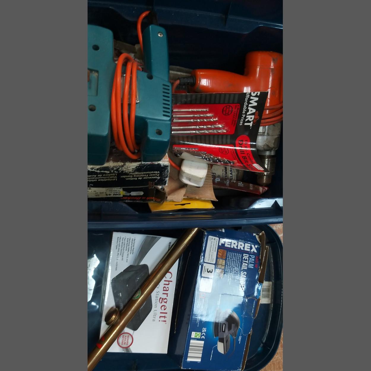 Mixed box of tools to include boxed charger, boxed detail sander and much else.
