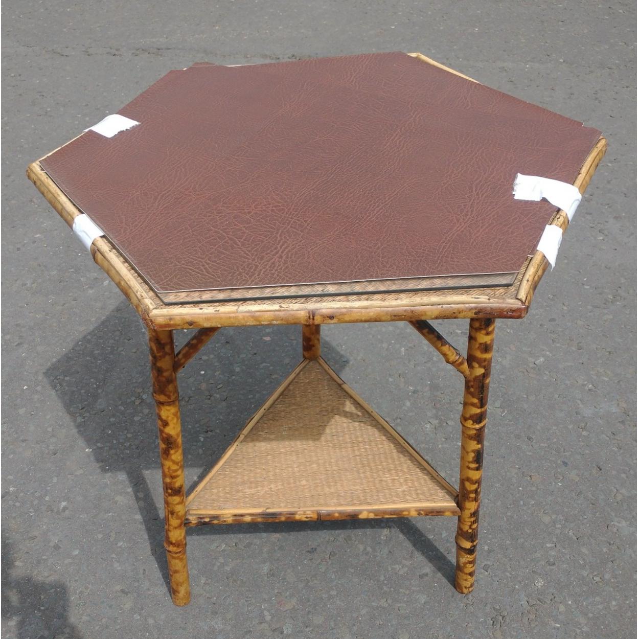 A hexagon topped bamboo glass topped table standing 67cm tall approx.