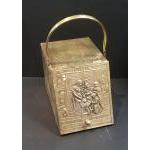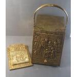 A copper log box with handle. 40cm x 26cm x 30cm excl. handle. With a matching paper rack.