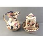 Lovely collection of five ANTIQUE MASONS IRONSTONE pieces, all in good condition with no chips or cracks. All MANDALAY pattern. Comprises jug 17cm, dish 26cm both approx, two other trays and a lovely tea caddy. A good collection of these collectible pieces.