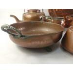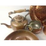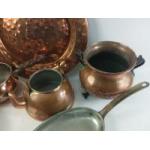A box of copper kitchen ware items as well as decorative tray comprising four graduated frying pans, kettle, cauldron, fondue pot and others as well as a 34cm copper tray.