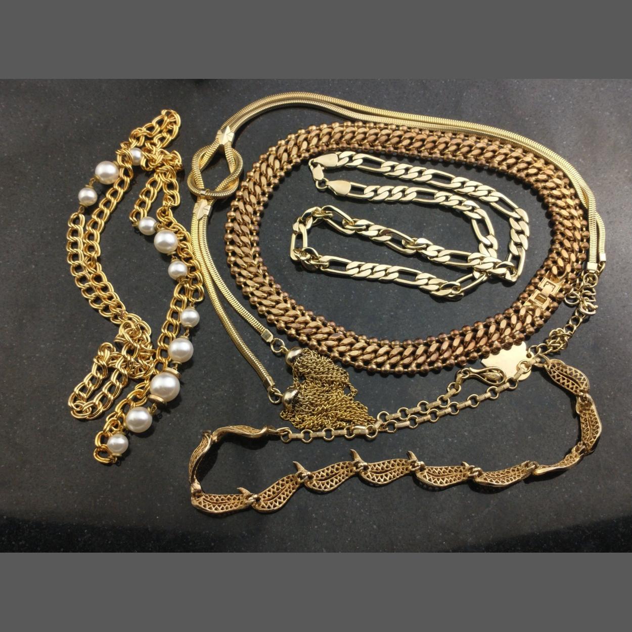 A shiny collection of yellow metal costume necklaces. Five pieces in total.