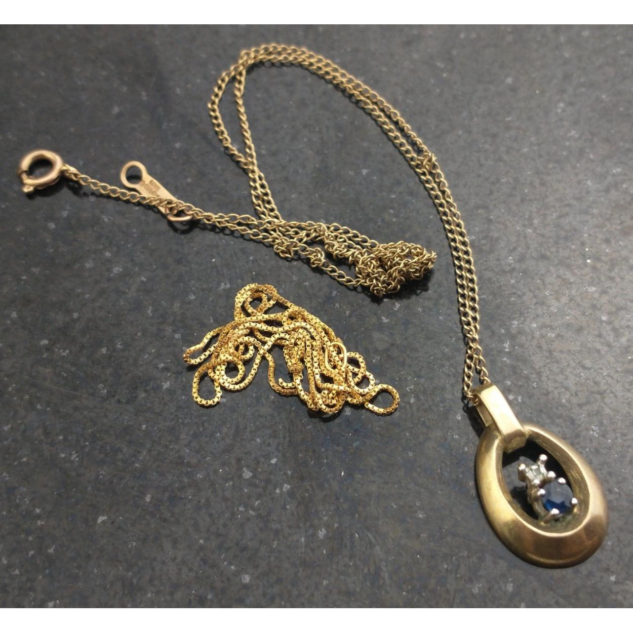 A 9ct stamped pendant on a 375 stamped chain with small central stone. Note chain is heavily knotted and tangled. Gross weight 2.6g approx. With one other broken yellow metal chain 0.5g approx