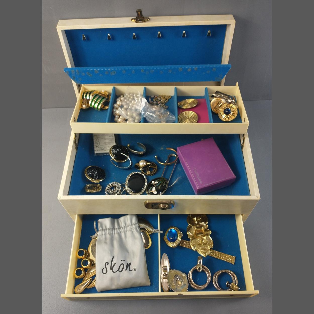 A distressed cream coloured cantilever jewellery box with contents of chunky costume jewellery including necklaces, brooches and earrings