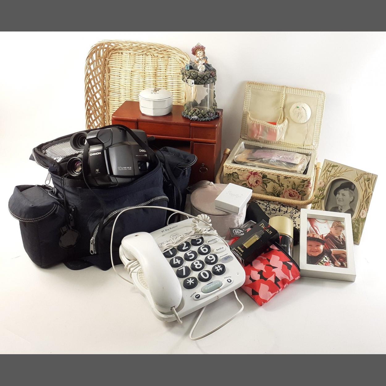 A mixed box to include a wicker tray, a BT big button phone, a CHINON video camera in carry bag, jewellery box, small sewing box etc