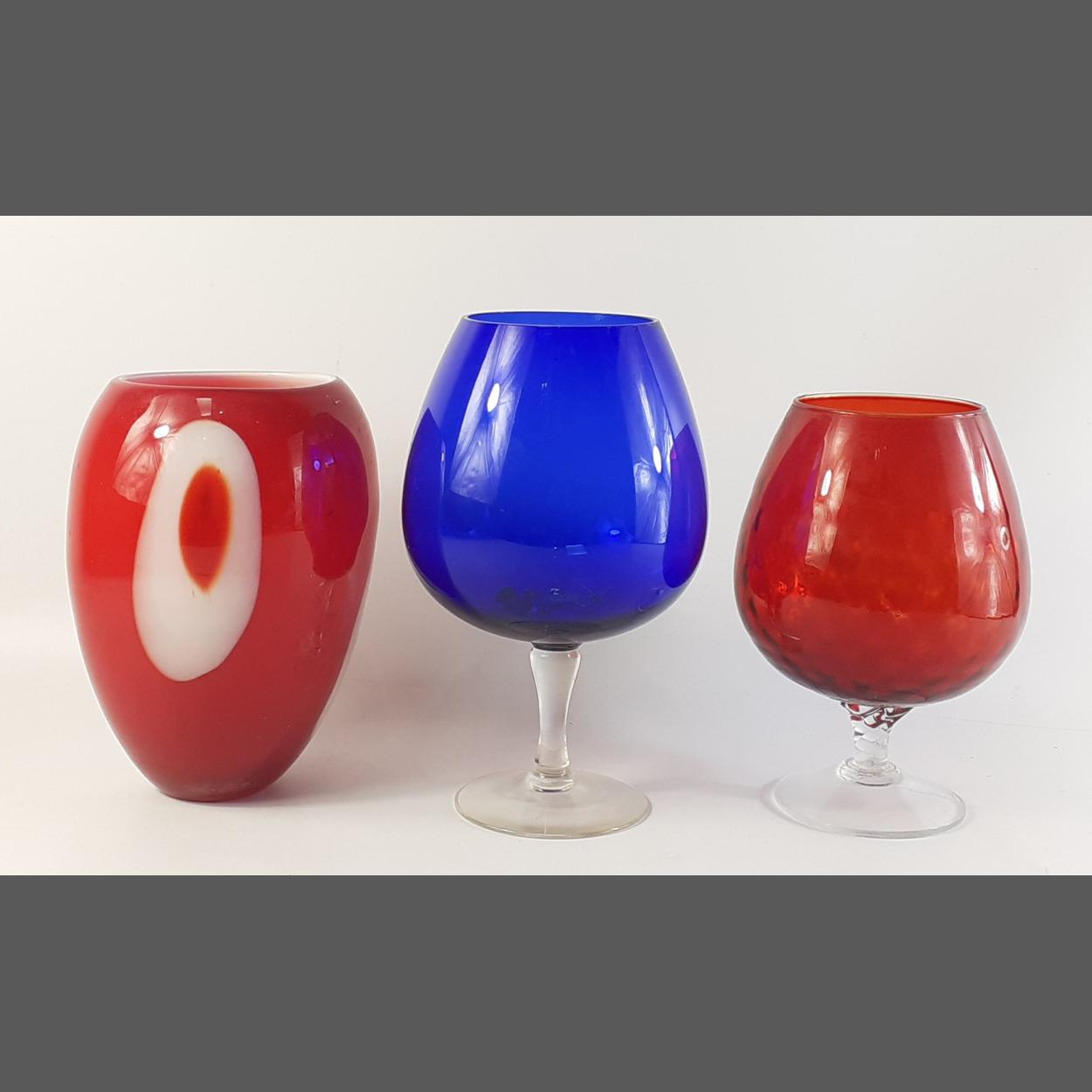 Two over-sized brandy glasses - blue one stands 27cm tall, the red one 23cm approx plus a red glass vase 24cm tall approx
