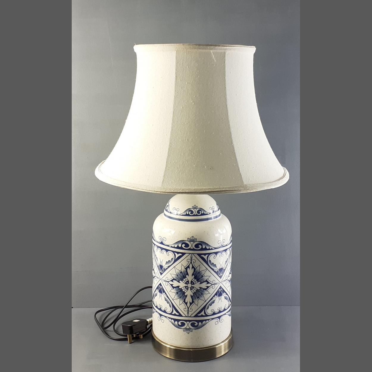 An impressive modern blue and white table lamp with shade. Stands 65cm tall incl. shade.