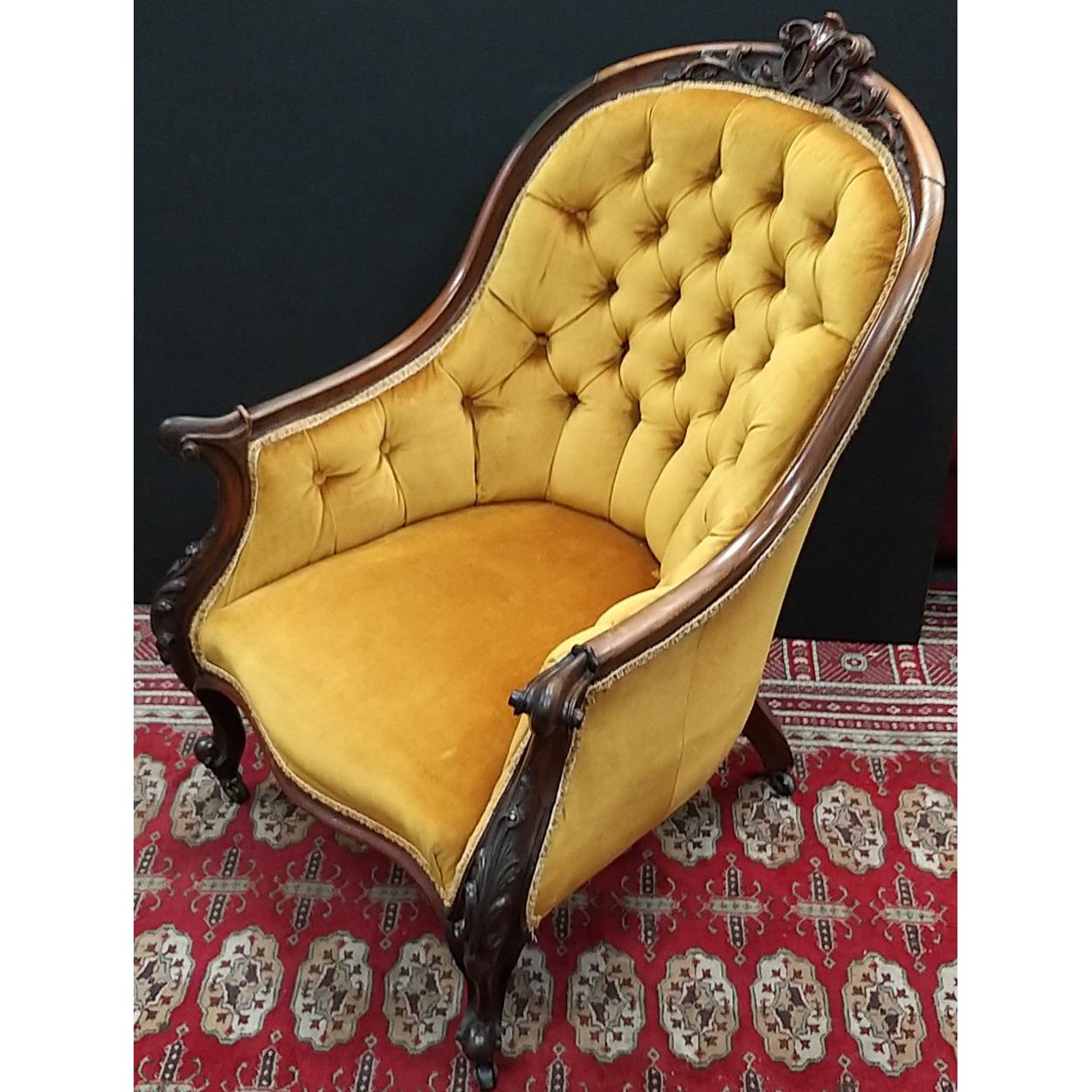 A VICTORIAN plush wooden armchair with attractive deep buttoned gold fabric. Nicely carved top finial.