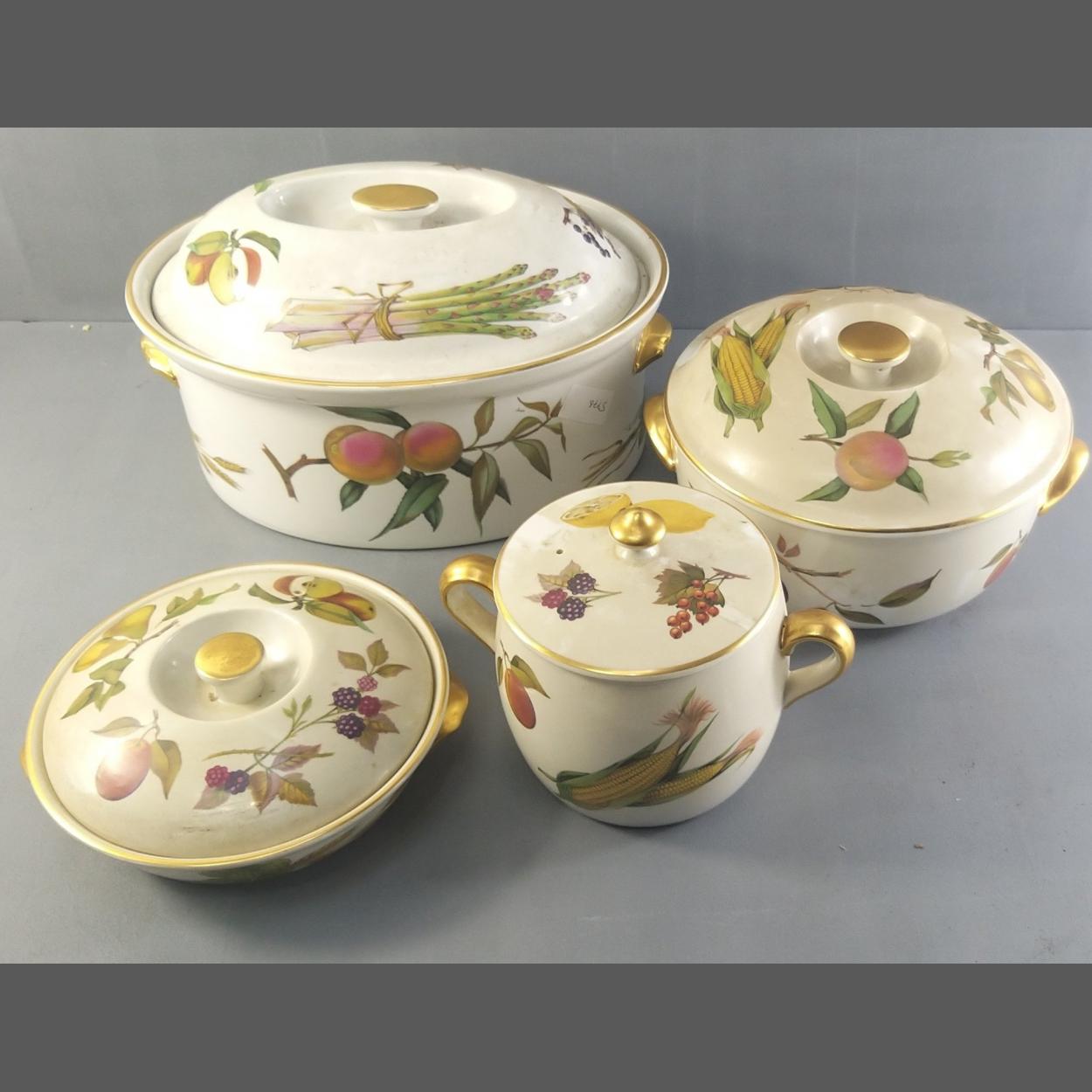 A box of ROYAL WORCESTER Evesham ware to include 3 lidded casserole dishes and a biscuit barrel