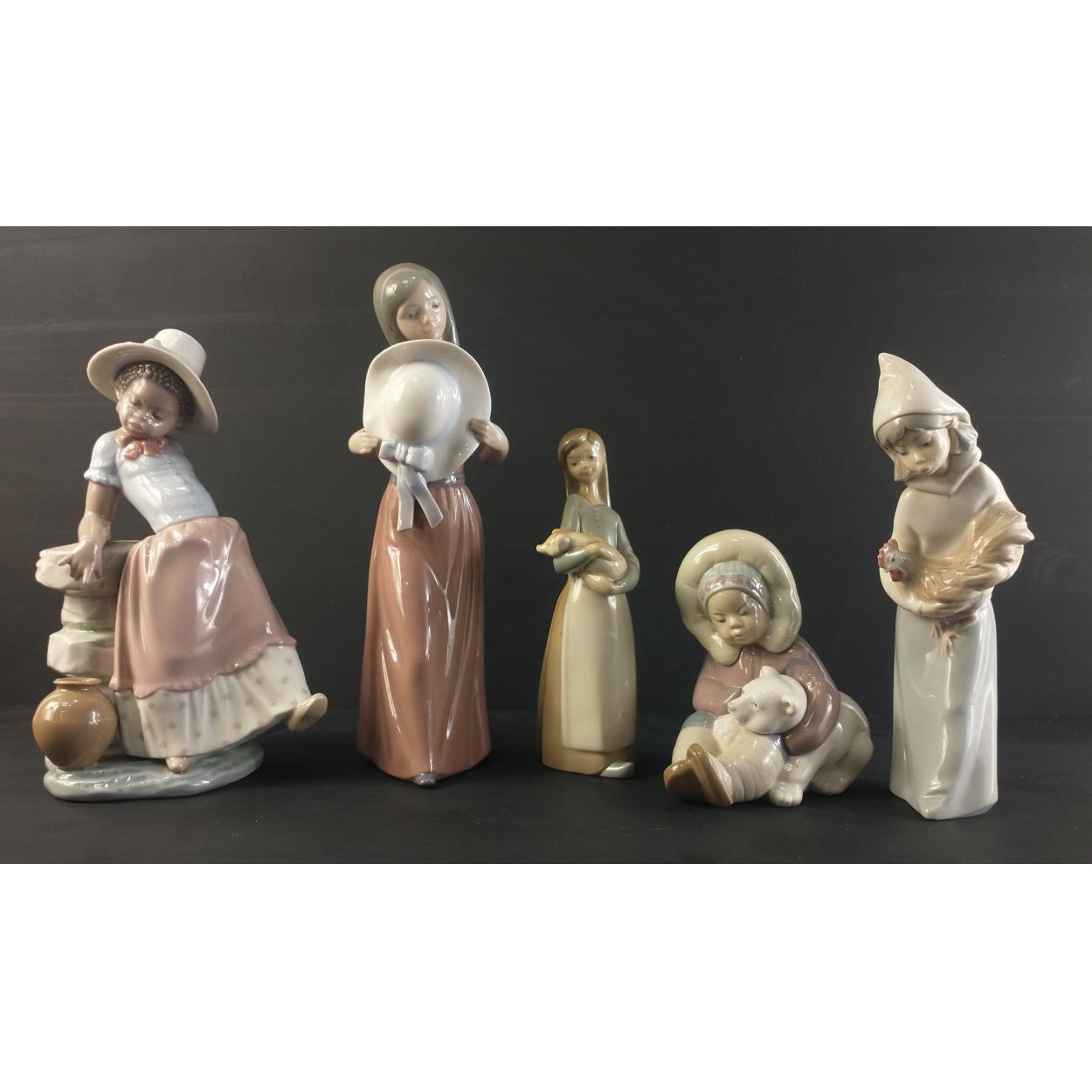 A LLADRO Daiso 1982 figurine (23cm approx), of a girl in a hat, a LLADRO girl holding a hat, a LLADRO Inuit child with polar bear cub, a LLADRO girl with pig and also one with a chicken