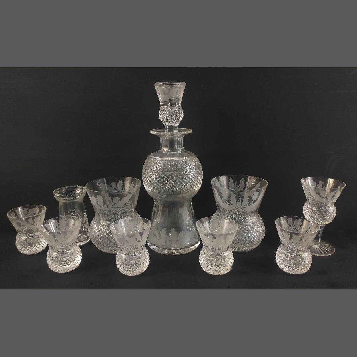 A collection of pressed glass THISTLE WARE including 5 small tot glasses, 2 large tot glasses, a small decanter, etc