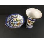 Two pieces of ROYAL ASHMORE ware decorated with butterflies and gilt highlights, to comprise a vase 15cm approx and a small footed bowl (15cm dia)