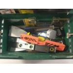 A toolbox footstool stuffed full of tools including hammers, screwdrivers, fixtures, fittings, with a tool tray with vintage blow torch and others.