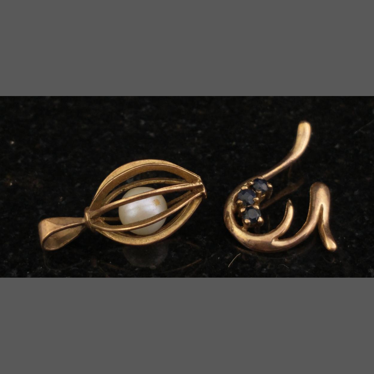 Two small pendants both stamped 375, one a cage with pearl 15mm approx, the other set with 3 blue stones 20mm approx. Gross weight 2.32g approx