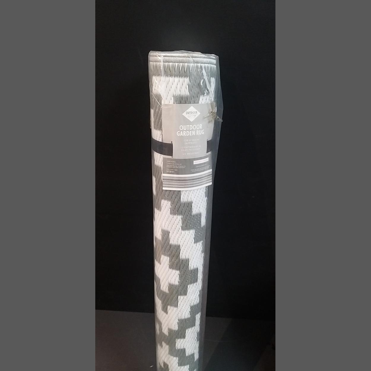 An as new outdoor garden rug. 120 x 180cm approx. Lightweight easy clean, UV resistant. An attractive grey shade.