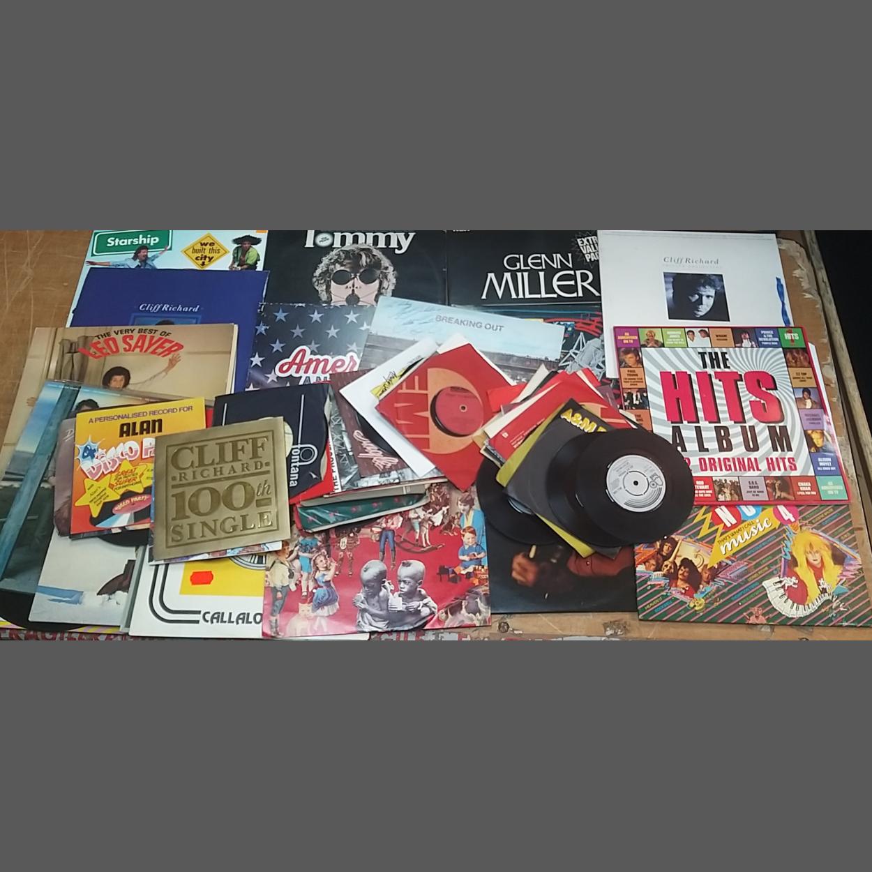 A small record collection comprising 45rpm singles mainly 70s/ 80s to include Proclaimers, David Essex, Cliff, Jackson Five, Supertramp etc. With some LPs such as Starship, Eagles etc and much else including A SIGNED BY FREDDIE GARRITY Freddie and the Dreamers album.