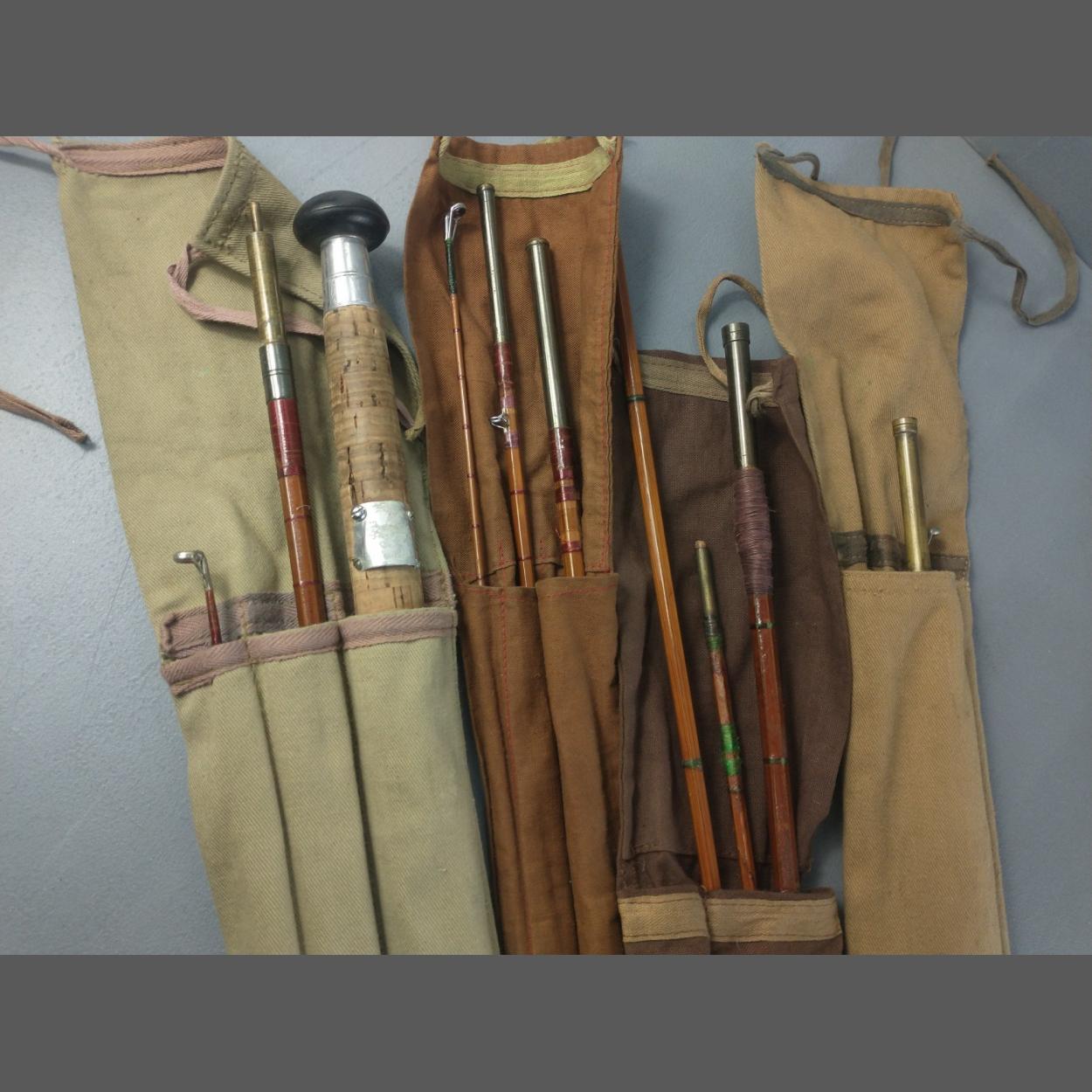 FISHING RODS. A three piece split cane rod, a POOLE & SON two piece split cane rod and two others.