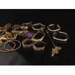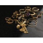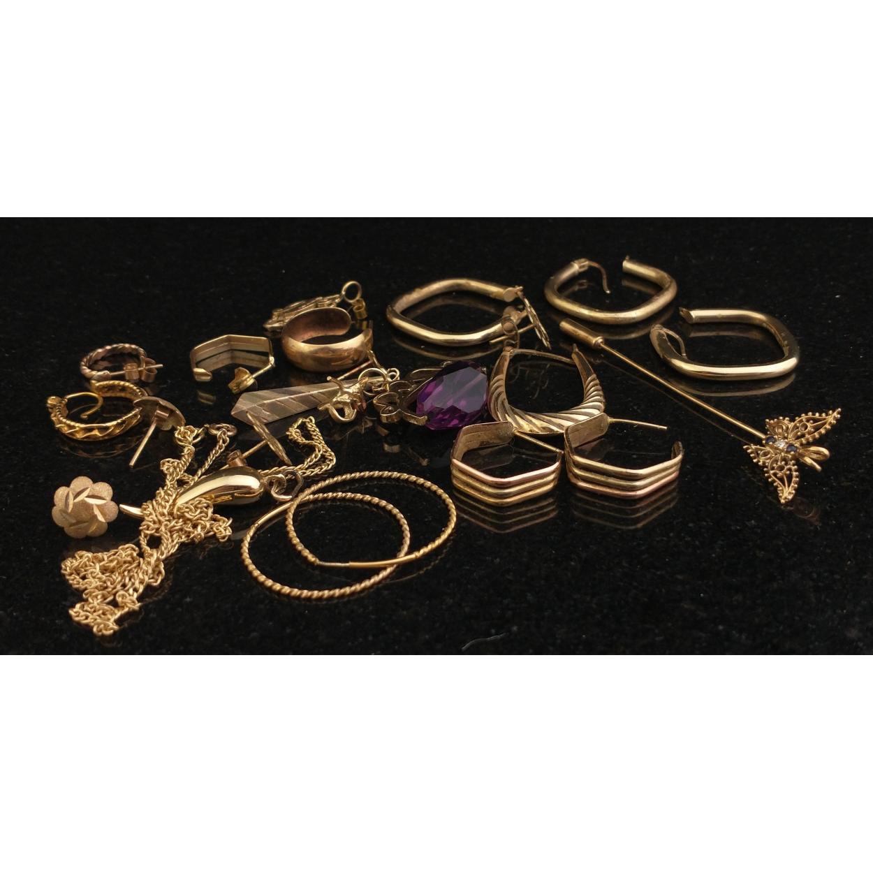 A PIRATES HOARD! A quantity of stamped 9ct / 375 jewellery pieces such as earrings, chain etc. Total weight 20.2g approx Plus a 375 stamped fob with large amethyst coloured glass stone, gross weight 4.4g approx
