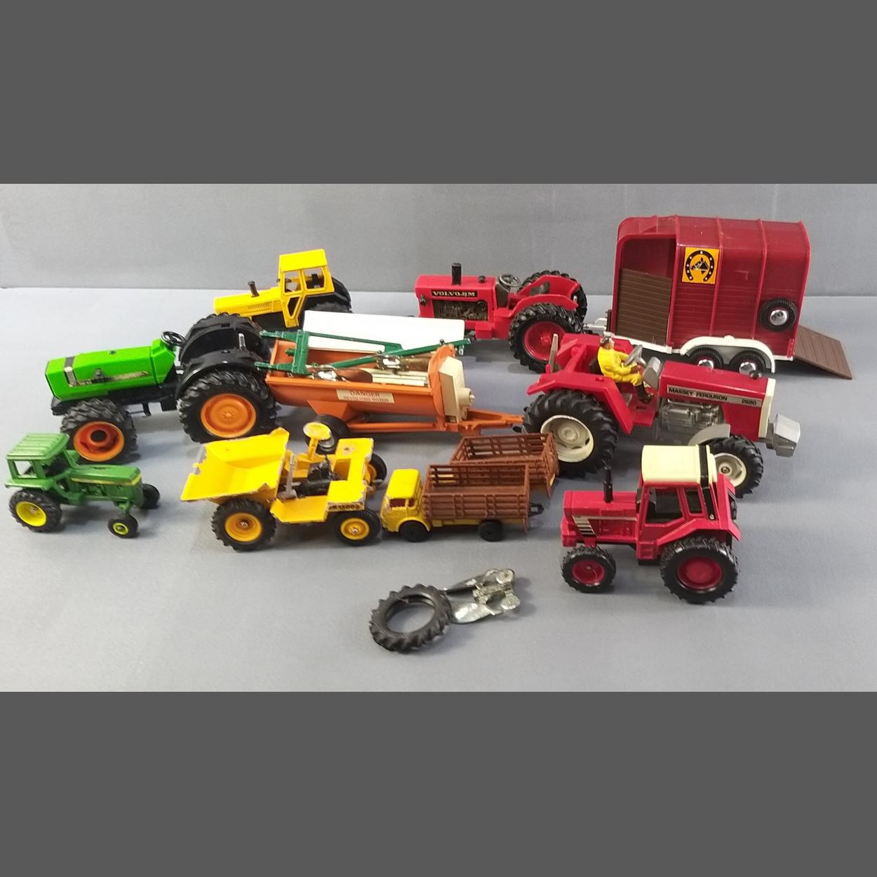 A super lot of diecast TRACTORS and farm implements. Mainly BRITAINS. All in good played with condition.